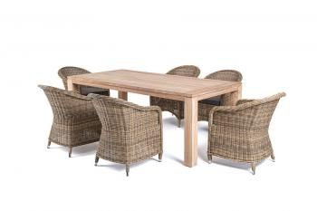Обеденная группа на 6 персон. Стол из тикового дерева. Все стулья с подлокотниками и подушками, алюминиевый каркас, искусственный ротанг.