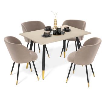 Дизайн выполнен в современном стиле с акцентами золотого цвета и контрастом черного муара. Микровелюровая обивка и поролоновый наполнитель обеспечивают комфорт и мягкость. Стулья оснащены подлокотниками и эргономичной спинкой, что делает посадку удобной и устойчивой.