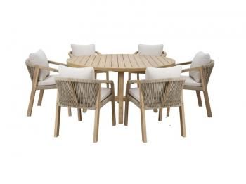 RIMINI – современная коллекция садовой мебели из акации, выполненная в комбинации натурального веревочного плетения rope, массива акации и бежевых подушек.