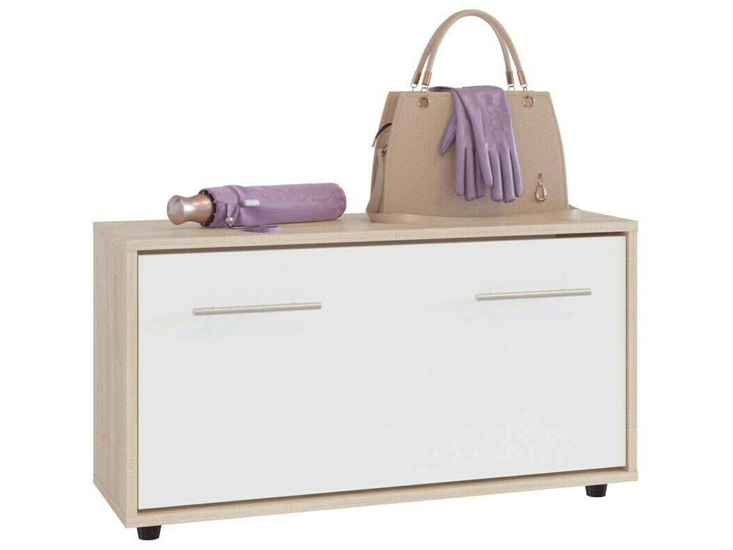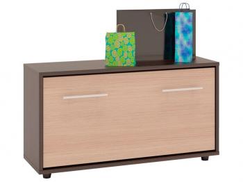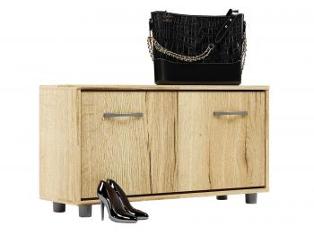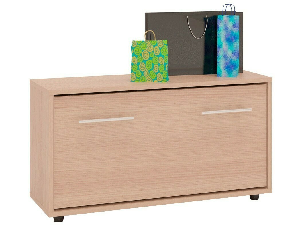 Широкая низкая тумба для обуви. Дверь оснащена откидывающимся механизмом со специальными полками для размещения обуви, который обеспечивает удобство хранения и легкий доступ к необходимой паре кроссовок или туфель.