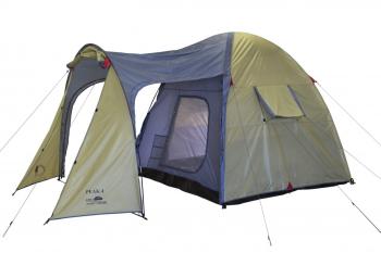 Вместительная 4х-местная палатка Indiana Peak 4 для отдыха на природе. Вход в тамбур и в палатку осуществляется с трех сторон. Довольно вместительный тамбур позволяет дополнительно размещать и хранить вещи. Спасаться от яркого солнца или дождя возможно под широким навесом, разместив под ним два походных стульчика.