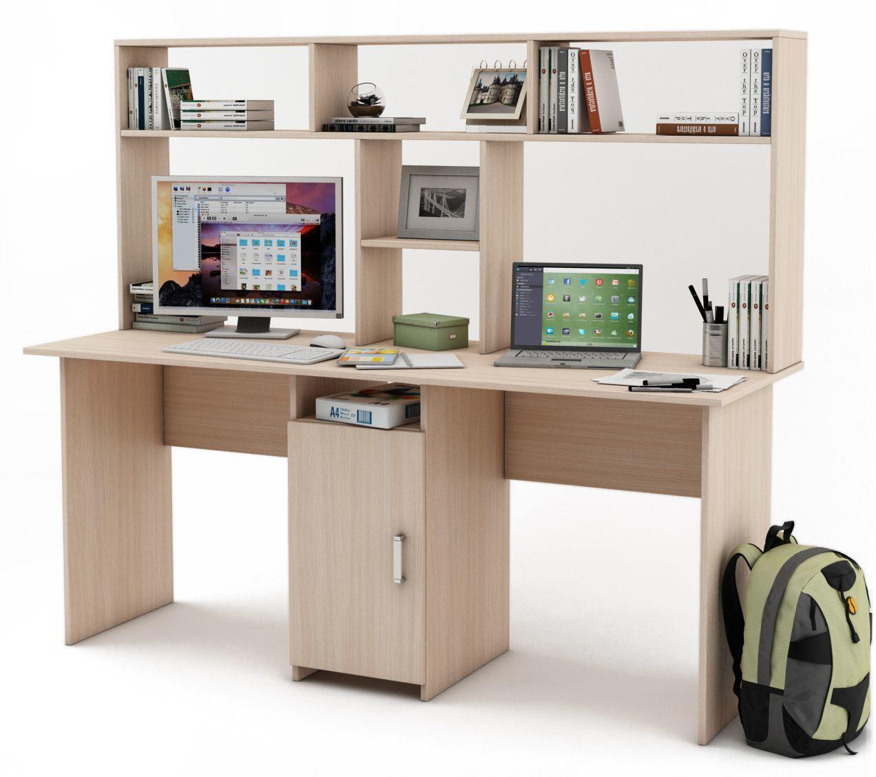 Письменный стол МФ Владимир Лайт-10 с надстройкой – предусматривает просторную столешницу разделену на два полноценных рабочих места. Также здесь есть многофункциональная надстройка с несколькими полками открытого типа. Внизу, посередине есть шкафчик, который закрывается дверкой. Над шкафчиком расположилась дополнительная полочка открытого типа. Это красивая функциональная мебель, которая отлично дополнит любое интерьерное решение. Подобная модель станет хорошим дополнением к рабочему кабинету. Стол достаточно просторный, но при этом не занимает много места. Также с помощью такого стола можно обустроить детям или подросткам, отличное место для учебы.