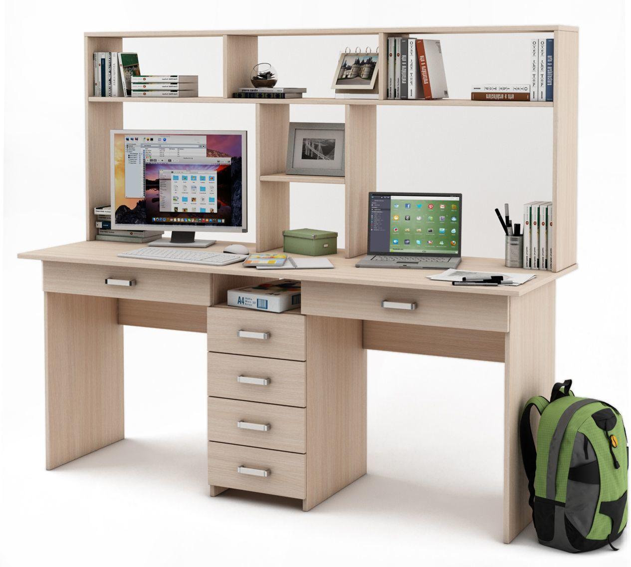 Письменный стол МФ Владимир Лайт-11Я с надстройкой – предусматривает просторную столешницу разделену на два полноценных рабочих места с двумя выдвижными ящиками под рабочими поверхностями. Конструкция предусматривает просторную надстройку разделену на шесть полок открытого типа. Внизу, посередине есть четыре выдвижных ящика. Над ними расположилась дополнительная полочка открытого типа. Это красивая функциональная мебель, которая отлично дополнит любое интерьерное решение. Подобная модель станет хорошим дополнением к рабочему кабинету. Стол достаточно просторный, но при этом не занимает много места. Также с помощью такого стола можно обустроить детям или подросткам, отличное место для учебы.