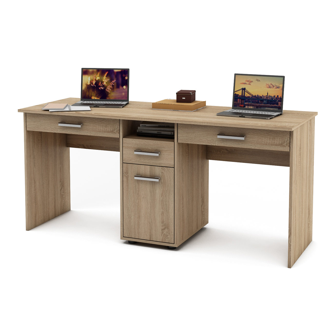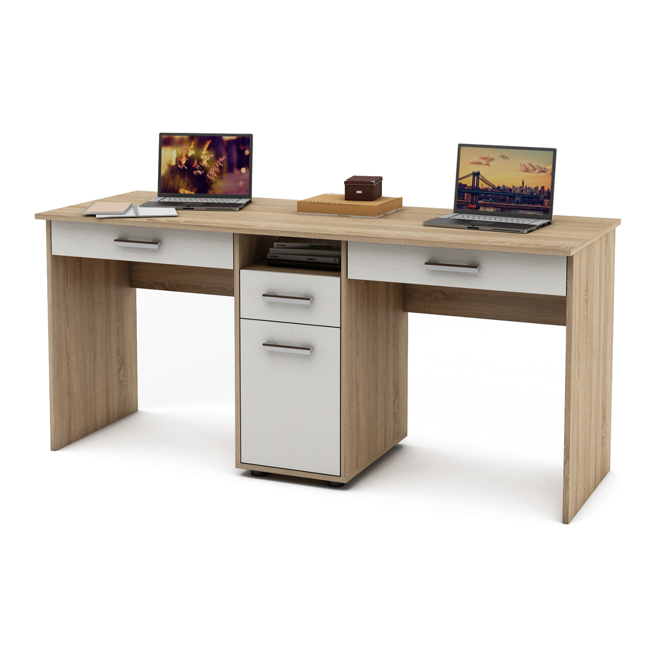 как имеет две рабочие зоны с одной общей тумбой, с нишей и общим выдвижным ящиком. У каждого стола имеется и свой выдвижной ящик, находящийся