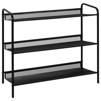 Этажерка выполнена из прочной металлической трубы диаметром 14 мм и стального листа в мелкую сетку.Три наклонные полки: каждая способна вместить до 3-х пар обуви и выдержать нагрузку до 8 кг.Полки имеют бортик, защищающий стену от грязной обуви.Дополнительный пластиковый декоративный крючок для обувной ложки.На ножках предусмотрены заглушки, защищающие пол от повреждения.Изделие поставляется в разобранном виде в картонной красочной коробке с ручкой.Простая сборка согласно инструкции, шестигранный ключ для сборки в комплекте.
