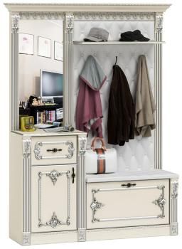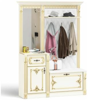 Очаровательная мебель, выполненная в ярком дворцовом стиле, оформит интерьер прихожей с волнующим великолепием и исключительным комфортом. Блеск зеркал и золота на филигранных резных элементах мебели, благородный цвет, каретная стяжка обивки, металлические элементы вида состаренной бронзы относят нас ко временам прекрасных дам и галантных кавалеров. Достойная самых высоких стандартов прихожая Визит доставит Вам эстетическое удовольствие и подчеркнёт сказочный статус дома. В тон к исключительному дизайну мебели идет и идеальная комплектация и превосходное качество исполнения прихожей. Данная комплектация прихожей располагает обувницей с открытой вешалкой и тумбой с зеркалом. Обувница порадует мягким сиденьем для комфортного переобувания и вместительной нишей с одной полочкой за откидной дверкой. Задняя панель в сочетании с мягким сиденьем оббита искусственной кожей затянутой методом каретной стяжки, и имеет три двухрожковых крючка для верхней одежды и антресольную полочку для головных уборов. Тумба порадует выдвижным ящиком для хранения мелочей, закрытую распашной дверкой нишей с полочкой внутри и большим прямоугольным зеркалом. Фактурный карниз, венчающий прихожую, в сочетании с пилястрами на фасаде мебели соединяет прихожую в единую привлекательную и выразительную конструкцию. Все элементы мебели, гармонично дополняя друг друга, составляют высокофункциональную, удобную мебель для прихожей. Прихожая изготовлена из безопасных материалов на современном компьютеризированном оборудовании при постоянной контроле производства. Такой тщательный подход позволил создать для Вас эту элитную мебель, гарантирует высокое качество и её продолжительный срок службы. Корпус прихожей изготовлен из ламинированной ДСП 16 мм, ламинированной плиты МДФ 16 мм, торцы деталей закромлены пленкой ПВХ 0,4 мм. Затейливый декор прихожей выполнен из прогрессивного материала – прочного и безопасного пенополиуретана, и с большим профессионализмом расписан золотом вручную. В качестве обивки мягких элементов мебели выбрана красивая, прочная и долговечная искусственная кожа с подложкой из плотного поролона.