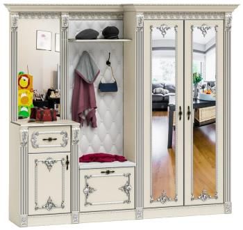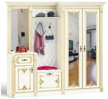 Блеск зеркал и серебра на филигранных резных элементах мебели, благородный цвет, каретная стяжка обивки, металлические элементы вида состаренной бронзы относят нас ко временам прекрасных дам и галантных кавалеров. Достойная самых высоких стандартов прихожая Визит доставит Вам эстетическое удовольствие и подчеркнёт сказочный статус дома. В тон к исключительному дизайну мебели идет и идеальная комплектация и превосходное качество исполнения прихожей. Данная комплектация прихожей располагает обувницей с открытой вешалкой, двухдверным шкафом и тумбой с зеркалом. За распашными дверками шкафа пространство поделено на две части, одна с выдвижной штангой для одежды, вторая – с тремя полочками. Сами дверки декорированы заключенными в золотые витые рамы зеркалами во всю высоту модели, что придает мебели барочный вид. Обувница располагает мягким сиденьем для комфортного переобувания и вместительной нишей с одной полочкой за откидной дверкой. Задняя панель в сочетании с мягким сиденьем оббита искусственной кожей затянутой методом каретной стяжки, и имеет два двухрожковых крючка для верхней одежды и антресольную полочку для головных уборов. Тумба порадует выдвижным ящиком для хранения мелочей, закрытую распашной дверкой нишей с полочкой внутри и большим прямоугольным зеркалом. Фактурный карниз, венчающий прихожую, в сочетании с пилястрами на фасаде мебели соединяет прихожую в единую привлекательную и выразительную конструкцию. Корпус прихожей изготовлен из ламинированной ДСП 16 мм ламинированной плиты МДФ 16 мм, торцы деталей закромлены пленкой ПВХ 0,4 мм. Затейливый декор прихожей выполнен из прогрессивного материала – прочного и безопасного пенополиуретана, и с большим профессионализмом расписан серебром вручную. В качестве обивки мягких элементов мебели выбрана красивая, прочная и долговечная искусственная кожа с подложкой из плотного поролона.