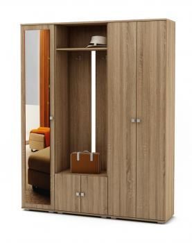 Прихожая Тунис 3. Корпус ЛДСП, Фасад ЛДСП + зеркало. Комплектация: Колонка бельевая 4 полки (дверь с зеркалом). Снизу закрытый отдел с 2 дверьми, за ними 1 полка, открытая полка над вешалкой. Шкаф распашной (полка под шляпы, полка для одежды + выдвижная штанга).