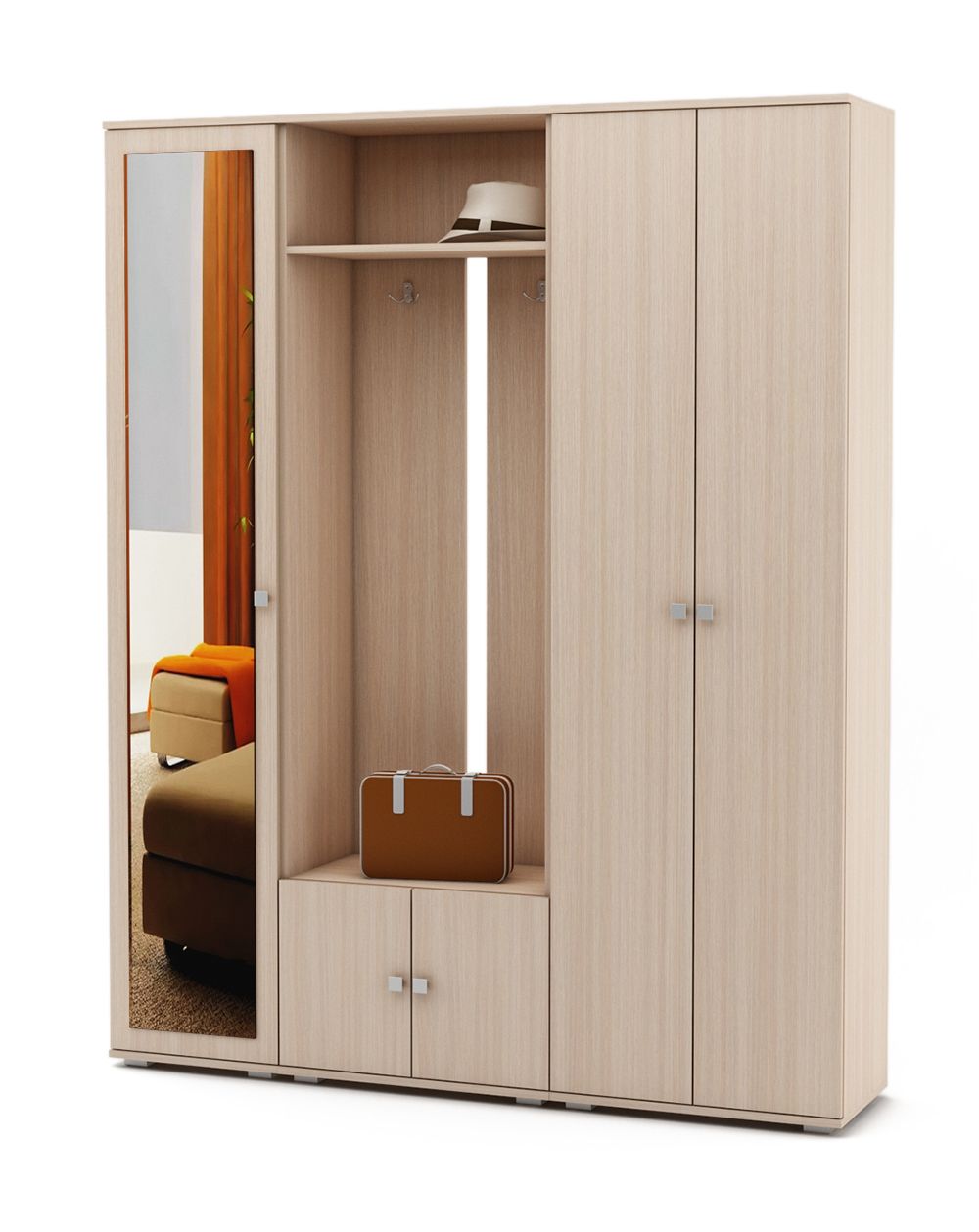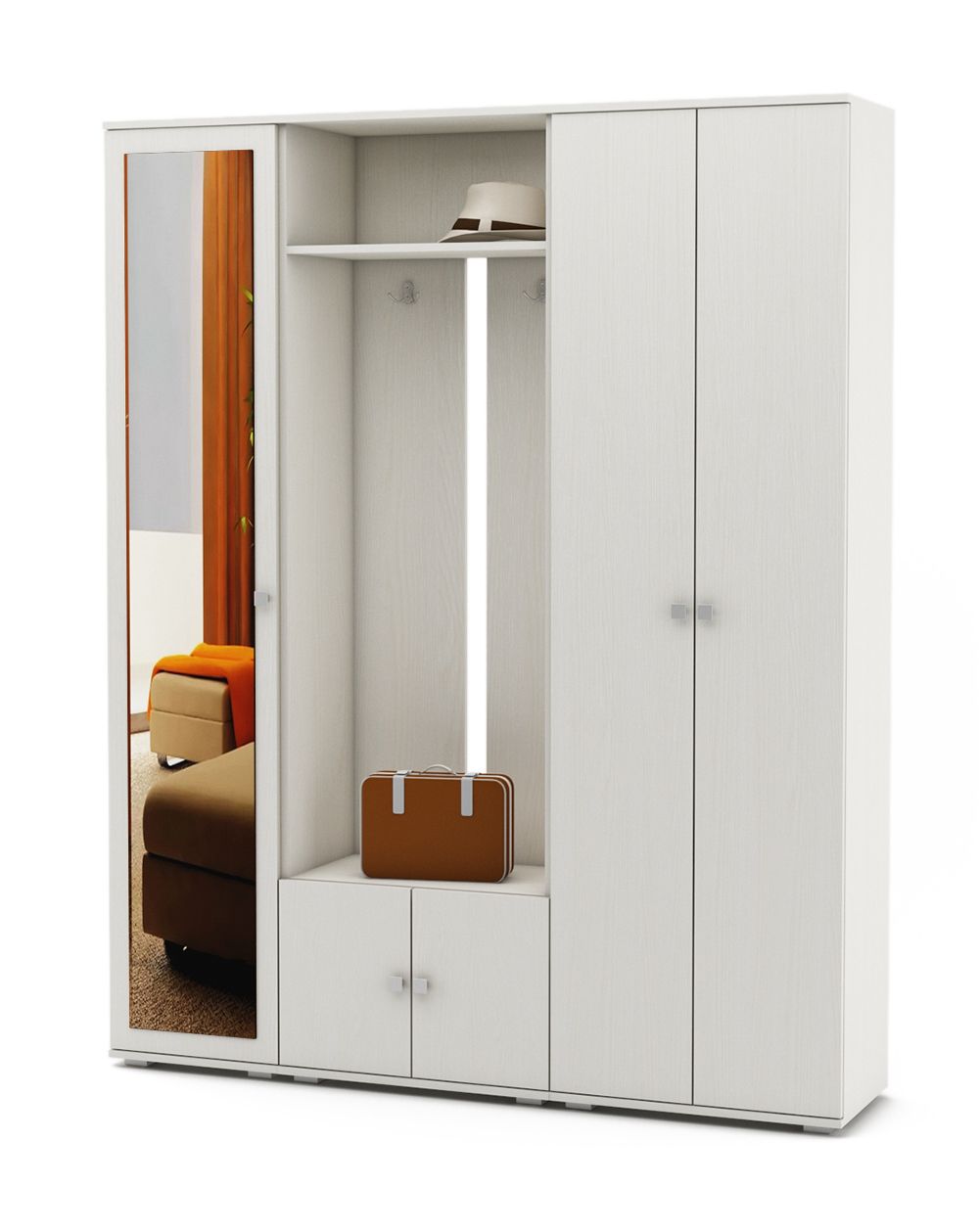 Прихожая Тунис 3. Корпус ЛДСП, Фасад ЛДСП + зеркало. Комплектация: Колонка бельевая 4 полки (дверь с зеркалом). Снизу закрытый отдел с 2 дверьми, за ними 1 полка, открытая полка над вешалкой. Шкаф распашной (полка под шляпы, полка для одежды + выдвижная штанга).