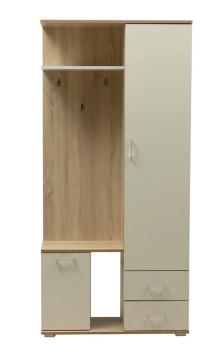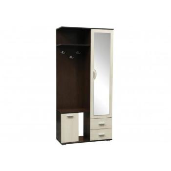 Комплектация: за распашной дверцей зеркалом расположены три полки. Внизу расположены два выдвижных ящика. В левой нижней части прихожей находится отделение с распашной дверью, посередине открытая ниша. Сверху панель с крючками и полка для головных уборов. Прихожая установлена на пластиковые опоры, не регулируемые по высоте.