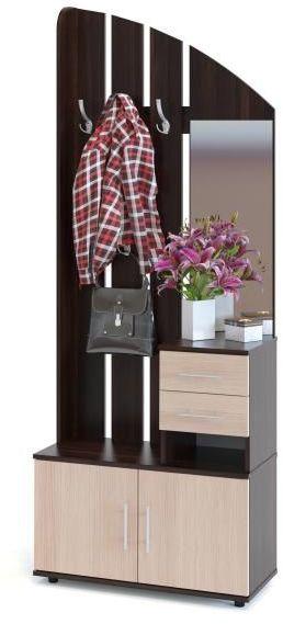 Компактная прихожая с открытой вешалкой (3 крючка), маленькими ящичками под зеркалом и вместительном шкафом внизу, который можно использовать в качестве обувницы (внутри полка). Над крючками располагается полочка для головных уборов. Прихожая универсальная, может быть собрана на любую сторону.