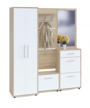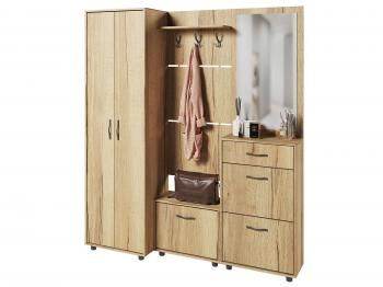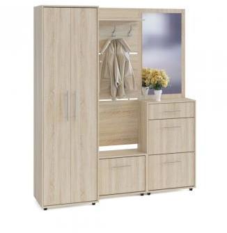 Вместительная модульная прихожая, состоящая из двух тумб для обуви, вешалки, зеркальной панели и двустворчатого шкафа. Двери тумбы оснащены откидывающимся механизмом со специальными полками для размещения обуви, который обеспечивает удобство хранения и легкий доступ к необходимой паре кроссовок или туфель.