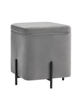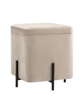 Компактный пуф на металлических ножках. Мягкая обивка выполнена из износостойкого велюра, тактильно приятный и долговечный материал. Металлические ножки черного цвета высотой 13 см. выдерживают нагрузку до 80 кг. Квадратная форма пуфа весьма практична и впишется в любой интерьер комнаты. Под сидением имеется ящик для хранения мелочей, крышка полностью съемная. Подпятники в основании ножек делают пуф более устойчивым и предотвращают скольжение.