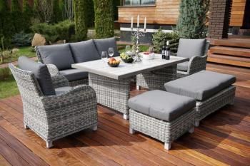 Каркас кресел, дивана и пуфика изготовлены из алюминия, легкий, прочный металл, совершенно не боится коррозии. Благодаря каркасу, изготовленному из алюминия, комплект мебели выдерживает большой вес. Покрытие кресел – искусственное пластиковое плетение имитирующее ротанг, отличается прочностью и долговечностью. Такое покрытие с легкостью выдерживает любые погодные условия.