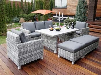 Комплектация: обеденный стол, два кресла с подушками, диван (трехместный) с подушкой на сидении и тремя подушками на спинке, два пуфика разного размера с мягкими подушками.