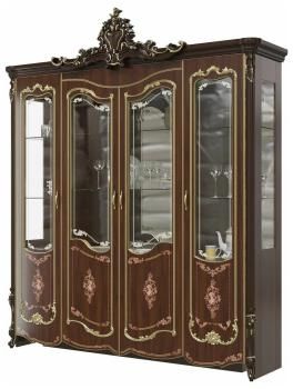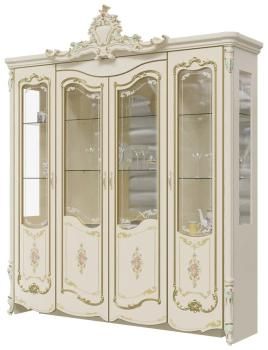 Шкаф 4-х дверный Шейх ГШ-05 – роскошная витрина станет яркой звездой в интерьере модного дворцового стиля. Конструктивно шкаф удобно разделён на три автономных отделения с распашными дверками со стеклом. В каждом отделении по три полочки, две из них стеклянные, толщиной 6 мм. Стекло фасадов украшено печатью. За распашными дверками со стеклом с художественной печатью – три полочки, две из них стеклянные, толщиной 6 мм. Боковые стеклянные вставочки и зеркало на задней стенке делают шкаф визуально лёгким и необычно воздушным. Витринная часть шкафа красиво презентует фамильную посуду, а в закрытой достаточно места для атрибутов застолья.