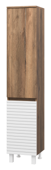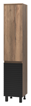 Пенал выполнен в стиле коллекции Dakota — строгие линии, матовая текстура и выразительная отделка под дерево в сочетании с тёмными фасадами делают его отличным выбором для интерьеров в стиле лофт, минимализм или современная классика.