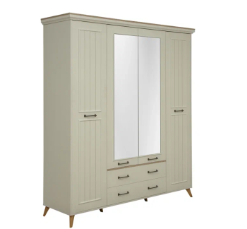 Шкаф 4-х дверный распашной для одежды 60.10 “Бора” с зеркалами и 2-мя выдвижными ящиками. Внутри шкаф оборудован штангой и полками. Изделие установлено на высокие пластиковые опоры. Направляющие ящика: Шариковые, полного выдвижения.
