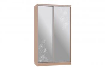 - Двери-купе: Двухстворчатая система с рамочным стальным профилем и зеркальными вставками с принтом и противоосколочной пленкой.