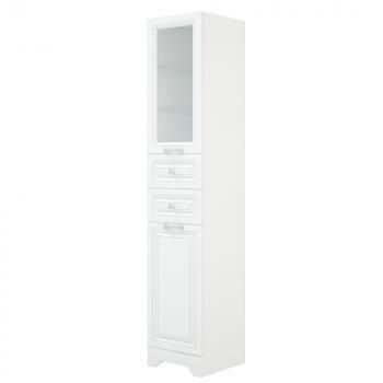 У пенала 1 распашная дверь сверху, позади вкладные полки. Дверь со стеклом. По центру 2 выдвижных ящика на направляющих скрытого монтажа. Высота ящиков 110 мм. Нижняя дверь откидная с корзиной. Все двери на петлях с доводчиками. У пенала снизу 4 регулируемые опоры. Фасады – плёнка ПВХ Белая, корпус – ЛДСП.