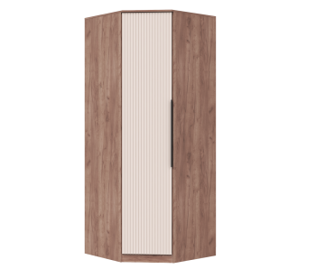 Шкаф угловой конструкции позволяет грамотно использовать свободный угол в любом помещении и экономить пространство. Для спальни в современном стиле рекомендуем выбрать шкаф Тоскана. Корпус модели выполнен из ЛДСП в древесном декоре “дуб табачный”. Фасад из МДФ в цвете “бисквит” украшен вертикальными полосами и черной длинной ручкой. Наполнение шкафа стандартное: комплект полок для вещей в сложенном виде и коробок и продольная штанга для деликатной одежды на плечиках.