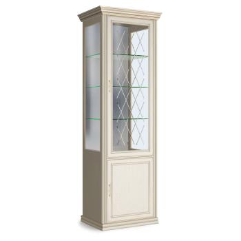 Украшением гостиной в современном классическом стиле послужит шкаф-витрина. Конструкция модуля разделена на 2 части, сверху прозрачная витрина со стеклянными боковинами и стеклодверью. По задней поверхности расположено зеркало, а стекло дверцы украшено орнаментом ромбы. В нижней части мебели закрытый отдел для хранения вещей.