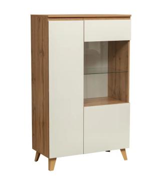 Шкаф – витрина из серии Авалон с 2-мя распашными дверями одна из которых со стеклом.Шкаф укомплектован полками одна из которых стеклянная. Изделие установлено на высокие ножки. Изготовлен из ЛДСП высокого качества.