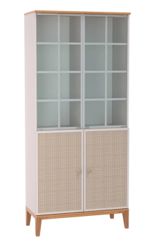 Шкаф-витрина 60.03 “Бора” со стеклом и распашными дверцами. Внутри шкаф оборудован стеклянными полками. Изделие установлено на высокие пластиковые опоры. Петли с доводчиком.