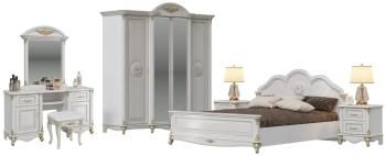 В данной комплектации спальня состоит из кровати 1600 c двумя прикроватными тумбочками, шкафа 4-х дверного, стола туалетного с зеркалом и пуфом.