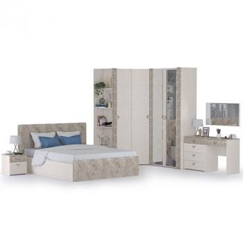 Гарнитур выполнен в благородной цветовой гамме с имитацией фактуры шелковой ткани (Шёлковый камень) и натурального камня (Бетон Чикаго беж). Мягкое изголовье и изножье кровати из ЭКО-кожи обеспечивают дополнительный комфорт.