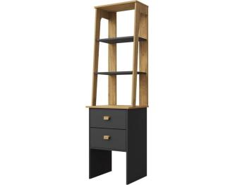 Ящики имеют детали, защищенные кромкой ПВХ толщиной 2 мм, что значительно увеличивает их долговечность. Задняя стенка стеллажа изготовлена из ХДВ, что обеспечивает дополнительную прочность конструкции. Деревянные ручки-кнопки на фасадах ящиков добавляют элегантности и удобства в использовании.