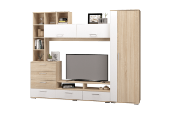 Стенка Даллас поможет правильно организовать пространство и создать необычайно уютную и комфортную атмосферу в вашей гостиной. Специальная ниша рассчитана для размещения телевизора и необходимой аппаратуры. На открытых полочках будут идеально смотреться семейные фотографии, любимые книги и оригинальные предметы декора. За распашной дверью шкафа находится выдвижная штанга для вешалок-плечиков и две полки. Выдвижные ящики пригодятся для хранения большого количества разнообразных вещей.