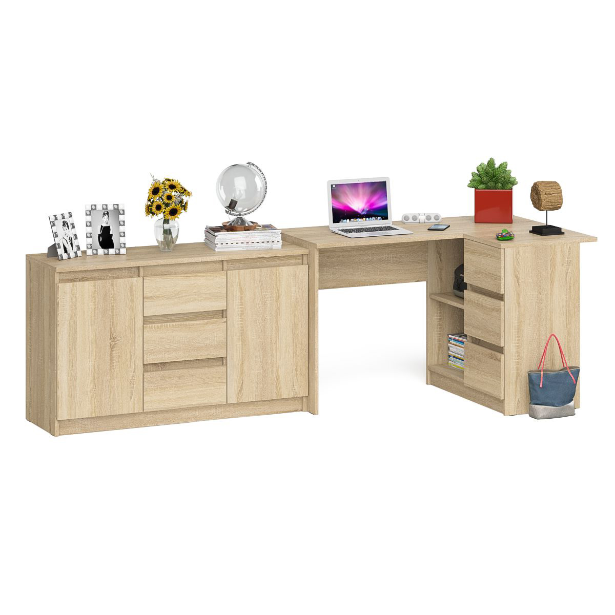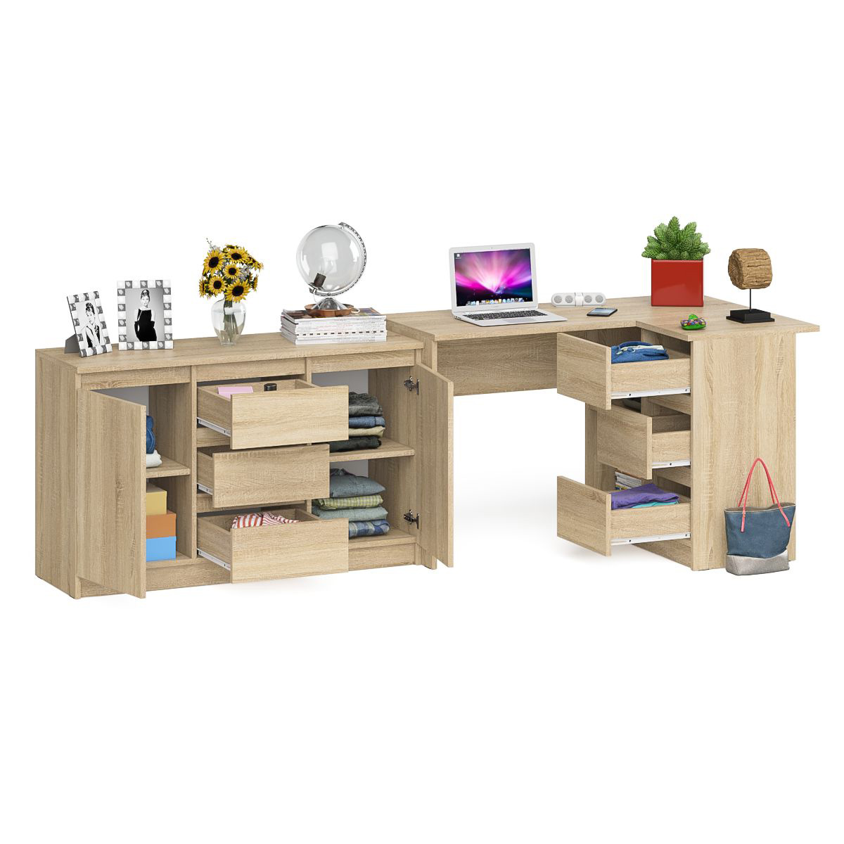 Комод-тумба три ящика и две дверки по бокам Мори МК1200.3 и компьютерный стол МС-16 правый. Габариты (ШхГхВ) 244,8х84,9х76,6 см. Выдвижные ящики справа. Не универсальная сборка. Отсутствие ручек главное преимущество данной модели. Угловой компьютерный стол МС-16 правый имеет 3 выдвижных ящика и нишу с полкой по середине. Комод-тумба оборудована по центру 3 ящиками и 2 закрытыми отделениями с полками по бокам.
