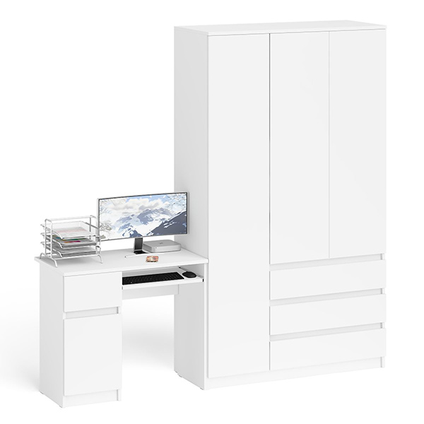 Компьютерный стол с тумбой с дверкой и ящиком левый и шкаф-комод Мори МШ1200-1. Габариты (ШхГхВ) 210,4х50,4х209,6 см. Ящик слева. Не универсальная сборка. Отсутствие ручек главное преимущество данной модели. Стол компьютерный МС-1 левый с тумбой и выдвижной панелью для клавиатуры. Широкий шкаф-комод оборудован тремя распашными дверями и тремя выдвижными ящиками.