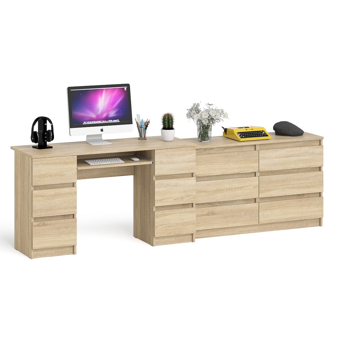 Комод Мори на шесть ящиков МК1200.6 и Стол компьютерный 2-х тумбовый Мори МС-2. Габариты (ШхГхВ) 255,8х50х76,6 см. Универсальная сборка. Отсутствие ручек главное преимущество данной модели. Компьютерный стол с 2 тумбами МС-2 оборудован 6 ящиками и выдвижной полкой для клавиатуры. Широкий комод оборудован 6 ящиками, расположеными по три в два ряда.