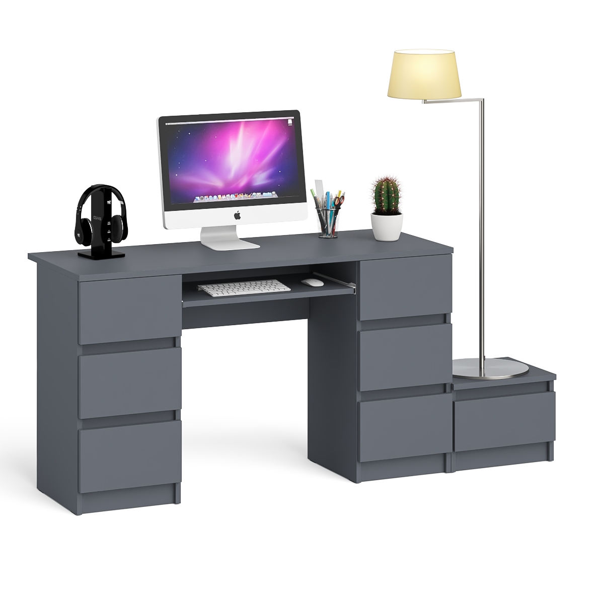 Компьютерный двухтумбовый стол Мори с дополнительной тумбой. Цвет – графит/белый. Габариты (ШхГхВ) 175,8х50х76,6 см. Универсальная сборка. Стол оборудован 6 ящиками, под столешницей по бокам расположены две тумбы с тремя выдвижными ящиками в каждой. Классическая тумба прикроватная с одним выдвижным ящиком. Можно использовать и как отдельный элемент.