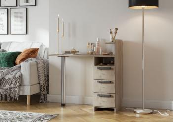 Оснащен тремя выдвижными ящиками на роликовых направляющих и открытой нишей.