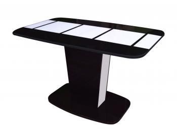 Раскладной обеденный стол на колонне. Столешница – ЛДСП 16 мм с кромкой ПВХ 2 мм, стекло с фотопечатью. Углы столешницы закруглены. С помощью синхронного механизма и специальной вставки стол раскладывается до 152 см в длину.