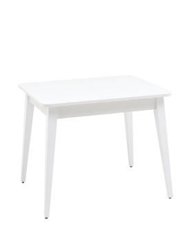 Прямоугольная столешница изготовлена из ЛДСП и покрыта слоем матового стекла. Покрытие очень простое в уходе, не впитывает жидкость и устойчивое к перепадам температуры. Квадратные ножки из массива дерева оснащены черными подпятниками, которые защищают напольное покрытие от царапин и препятствуют скольжению.