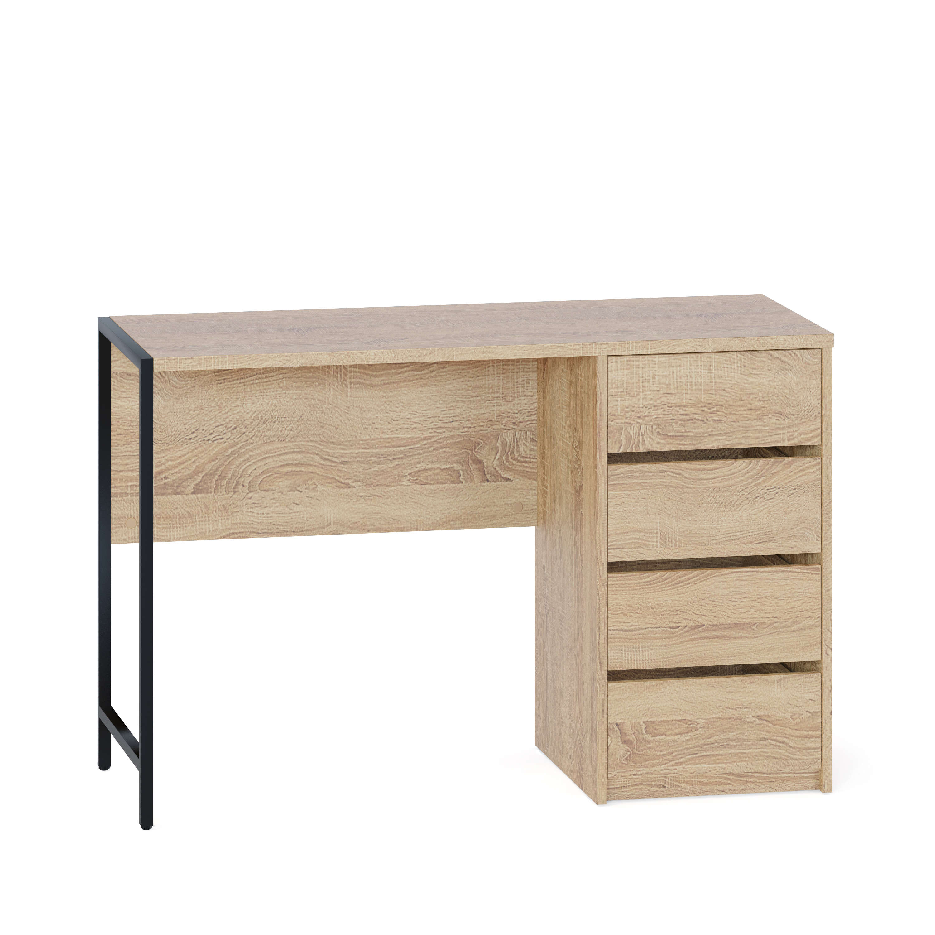 Модель включает вместительную тумбу, которая имеет четыре ящика, а также столешницу шириной 1170 мм и глубиной 449 мм, что позволяет удобно хранить все необходимые канцелярские принадлежности и документы. Ящики оснащены надежными шариковыми направляющими, что обеспечивает плавное и бесшумное открытие. Вместо традиционных ручек в конструкции предусмотрены стильные вырезы между фасадами, что добавляет изюминку.