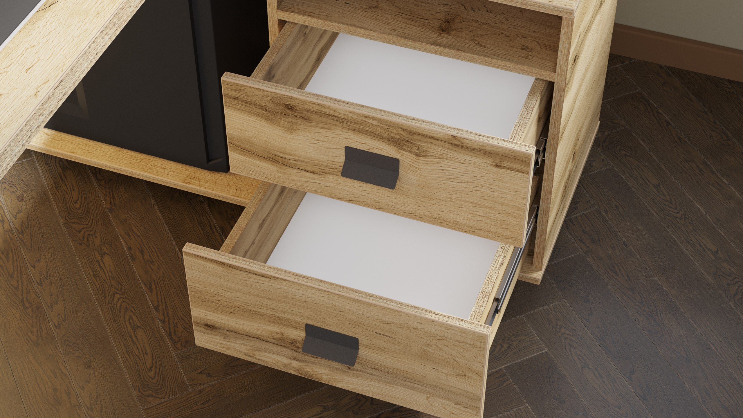 Встроенная тумба увеличивает полезную площадь размещения и имеет эстетически привлекательный внешний вид. Вместительные ящики на шариковых направляющих с бесшумным открытием из ЛДСП помогут организовать хранение различных предметов: книг, журналов, сувениров и прочих предметов интерьера.