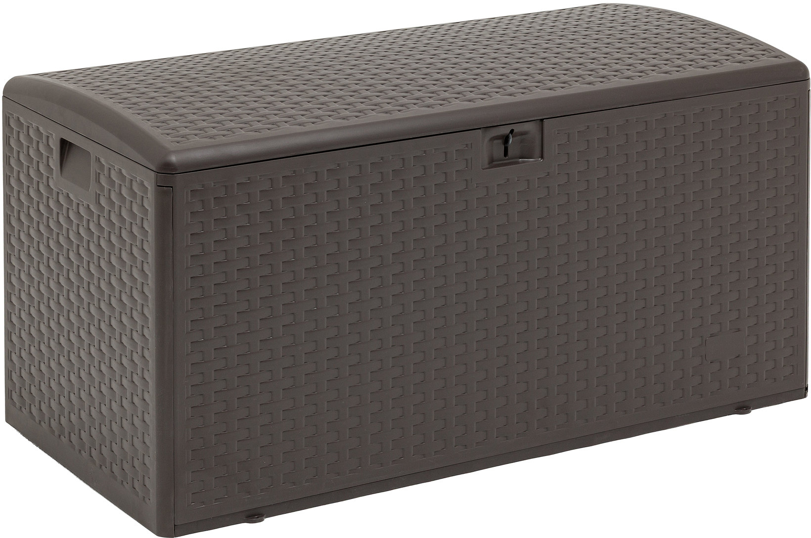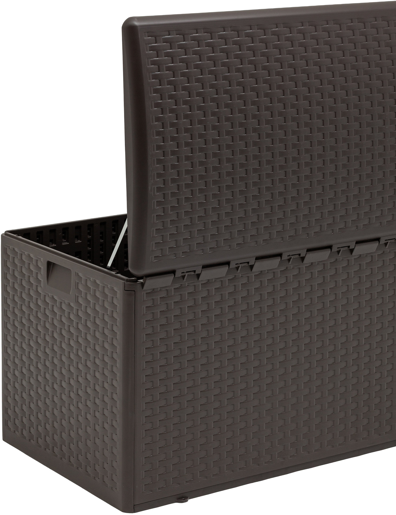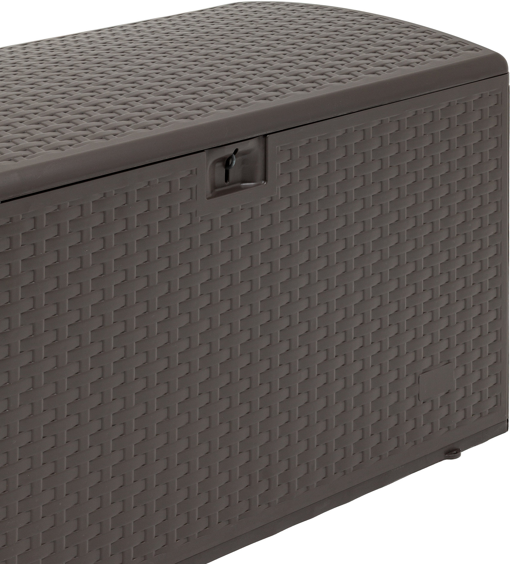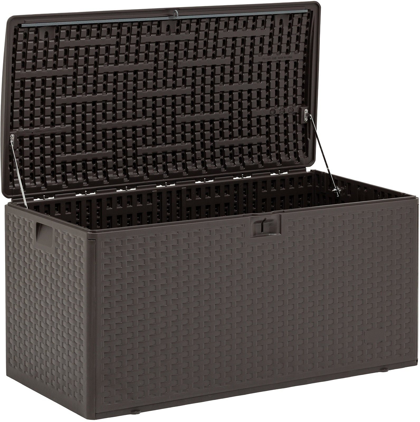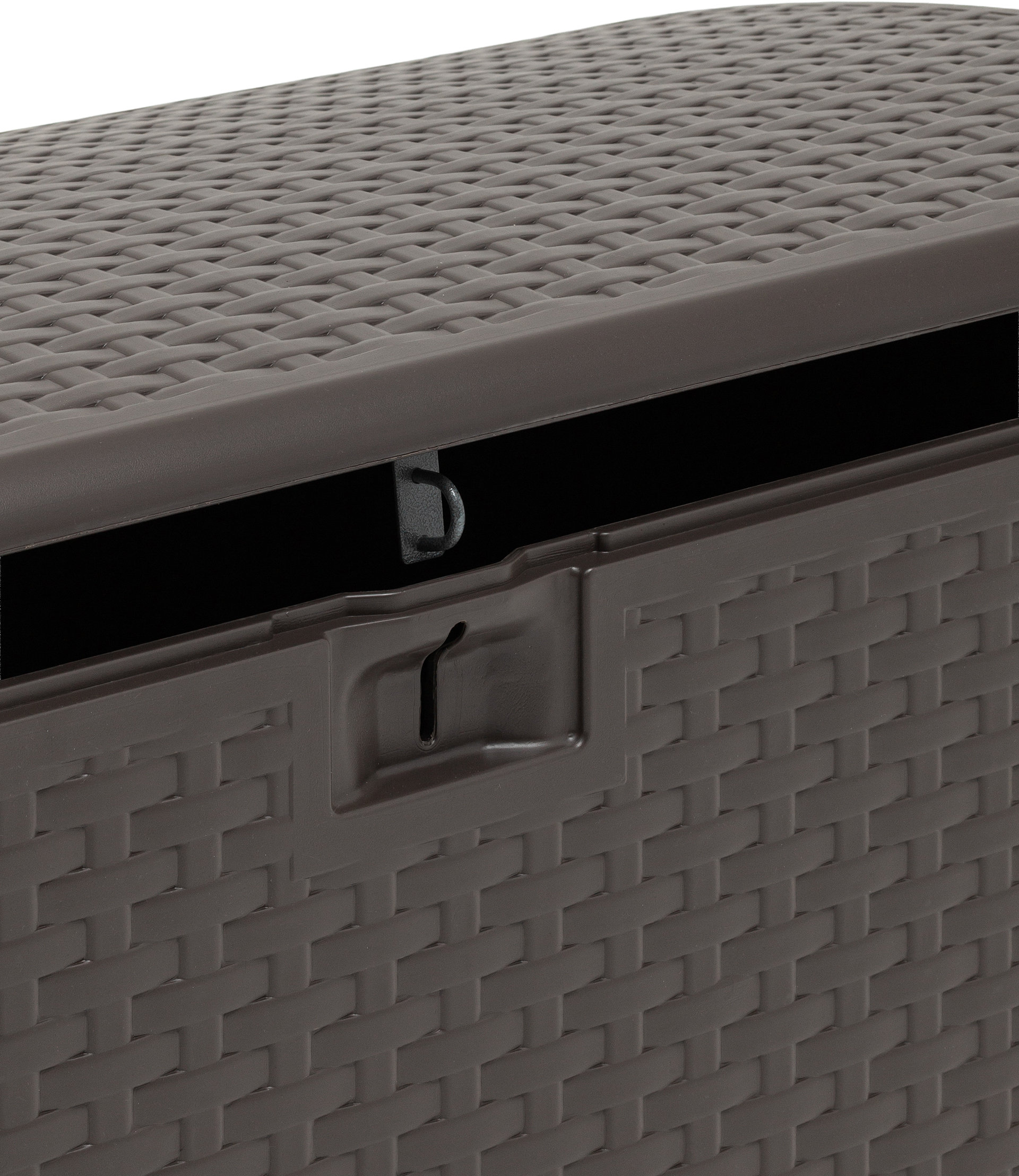 Объем сундука составляет 375 литров, что позволяет хранить подушки для садовой мебели, пледы, инструменты, игрушки или другие бытовые и дачные принадлежности. Крышка надежно закрывается, защищая содержимое от пыли и влаги, и одновременно служит удобной столешницей.