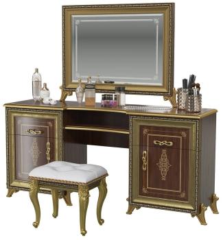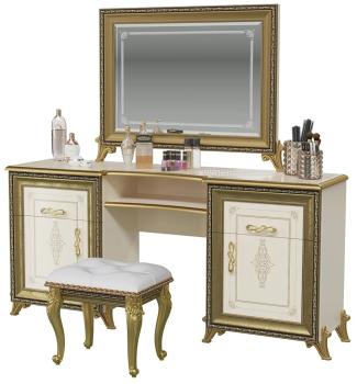 Классика форм мебели Версаль искусно дополнена богатством живописных декоративных элементов, созданных на основе инновационных технологий. Фасады стола туалетного украшены изысканными узорами шелкографией, золотой патиной каймы и витыми ручками «под старину». Пышность рельефного декора «с позолотой», изящество изогнутых ножек и зеркало с рисунком наполняют обстановку яркостью и выразительностью. Величие и королевский статус гарнитуру Версаль придаёт великолепная корона, креставно украшающая раму зеркала. Мебель для спальни Версаль произведена из высококачественных, экологичных материалов; корпуса – ламинированная ДСП 16 мм. фасады – МДФ 16 мм. Затейливый декор, красиво обрамляющий фасады мебели, выполнен из прогрессивного материала – прочного и безопасного пенополиуретана.