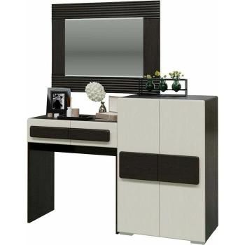 Компактный столик с ящиками, зеркало в раме и удобная тумба с тремя полками за распашными дверками – идеальная комплектация для дамского уголка!