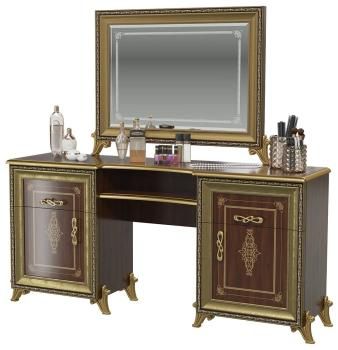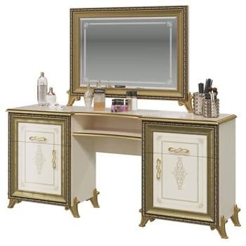 Очаровательный комплект мебели Версаль, выполненный в роскошном дворцовом стиле, внесёт в интерьер винтажные нотки шикарной старины. Аристократичный и практичный, устойчивой двух-тумбовой конструкции, стол создан для спальни прекрасной Королевы! Большая фигурная столешница с полочкой под ней и вместительные тумбы с закрытым отделением с полкой и выдвижным ящиком – классика комфорта. Даже привередливая красавица согласится, что места вполне достаточно для всего заказанного ею арсенала косметических средств и парфюмерии! Прелестное прямоугольное настольное зеркало на причудливых ножках-лепестка, элегантно украшено фацетом и пескоструйным рисунком. Ваш милый образ в обрамлении роскошной, богато декорированной «золотой» рамы будет выглядеть как старинный парадный портрет. Интересно дополнить этот комплект изящным мягким пуфом до сказочного туалетного ансамбля.