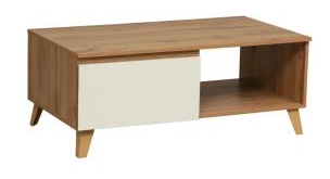 Стильный журнальный столик из серии Авалон с откидной дверцей и открытой полкой. Столик установлен на высокие ножки. Изготовлен из ЛДСП высокого качества.