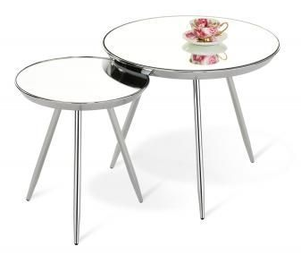 Столешницы из зеркала позволяют визуально расширить интерьер. Этот модный ход выручил интерьер многих покупателей. Столики смотрятся тонкими и невесомыми, поскольку имеют скошенный переход от лицевой поверхности к обратной. Хромированные ножки прекрасно гармонируют с зеркальными столешницами.