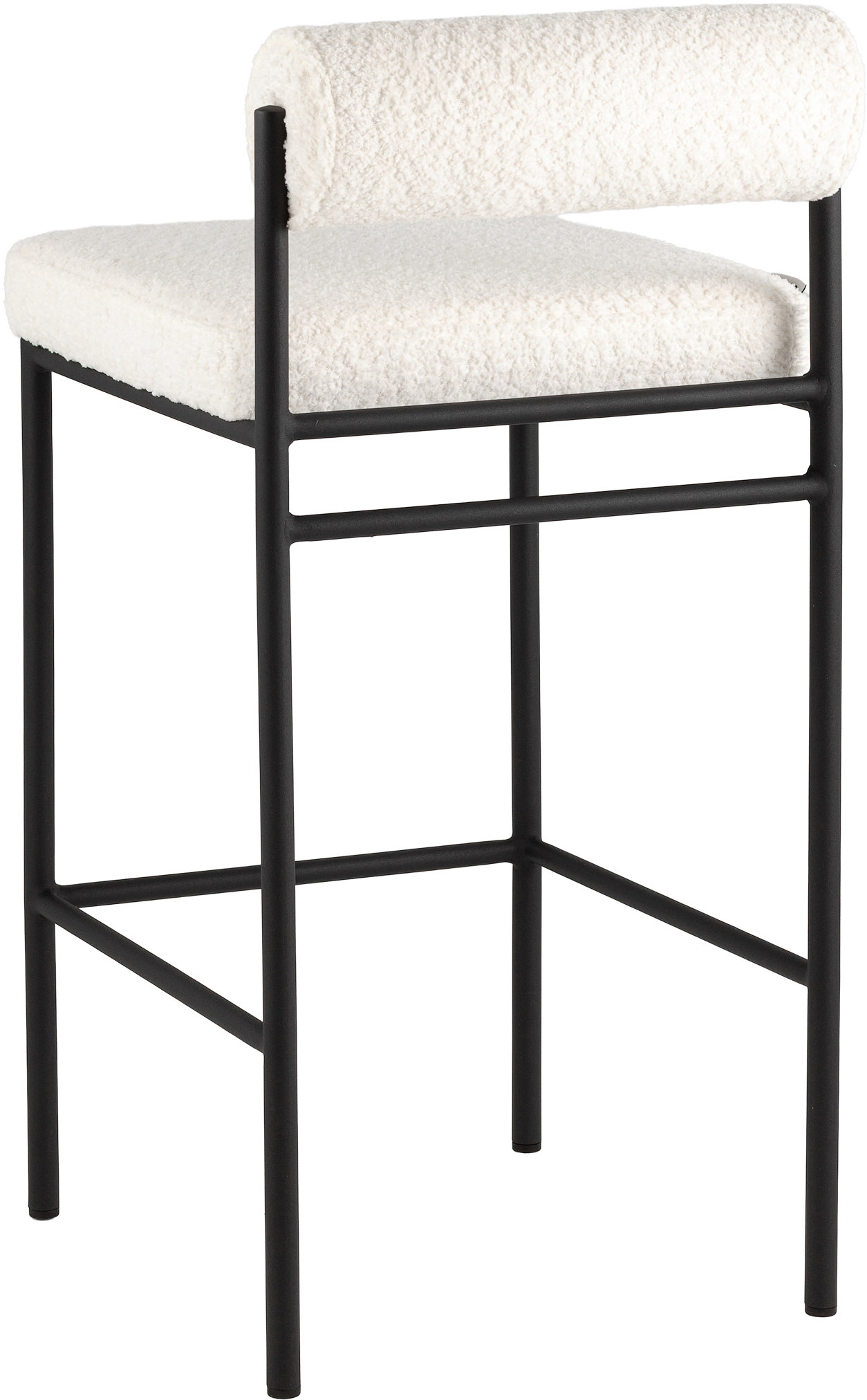 Каркас выполнен из металла, что обеспечивает высокую прочность и устойчивость при эксплуатации. Сиденье и спинка наполнены эластичным ППУ, благодаря чему стул остаётся мягким даже при длительном использовании. Спинка выполнена в виде валика, что создаёт удобную опору для поясницы. Высота сиденья составляет 65,5 см — идеально подходит для полубарных стоек и высоких обеденных столов.
