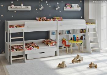 Трехъярусная кровать Легенда 25 комплектация 3 с двумя параллельными спальными местами для детей от 4 до 11 лет представляет собой компактное решение для небольших детских. Выполнена из высококачественного ЛДСП. Эта кровать – замечательный выбор для детской комнаты.