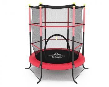 Цвет мата – черный, подушки безопасности и стойки – красный. Подушка безопасности находится внутри защитной сетки. Защитная сетка натянута до пола. Ножки батута и вертикальные стойки сделаны из оцинкованной стали. Мат – полипропилен, подушка безопасности верхний слой – полиэстер, нижний – нетканный материал, внутри – поролон, сетка – полиэтилен, рукав стоек – поролон, без верхнего ПВХ-покрытия.